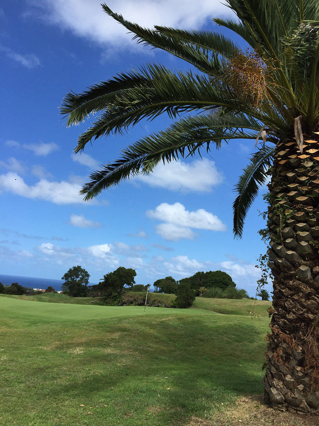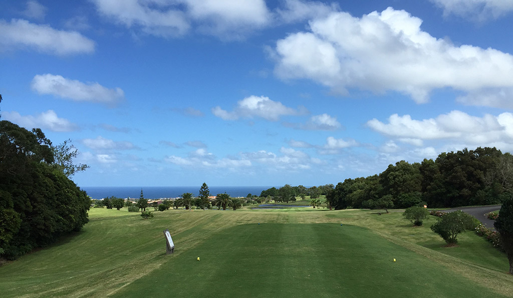Eine Spezialität der Azoren ist die unbeständige und höchst unterschiedliche Wetterlage. Tatsächlich hatten wir an unserem lediglich 25 Minuten entfernten Wohnort einigermaßen trübes und böhiges Wetter. Am und über dem Platz herrschten perfekte Bedingungen: wenige Wolken, 20 Grad, interessanter, aber nicht allzu beeinflussender Wind. Wie schon telefonisch angekündigt war der Platz nahezu leer. Es könnte also eine sehr schöne Runde werden.
