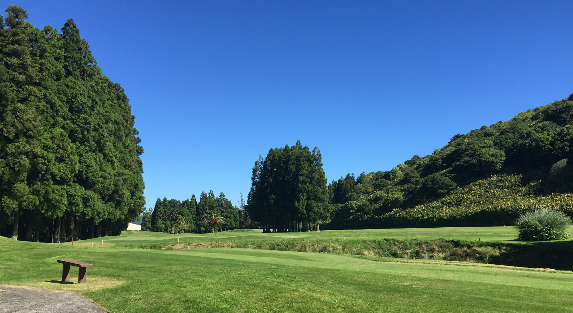 Dort bekam ich das gleiche Angebot wie schon ein paar Tage zuvor in Batalha, zahlte also für das Greenfee, einen Satz Schläger und ein Cart 93€. Ich hatte noch Lust darauf, mich vor der Runde ein bisschen auf der Range zu entspannen. Der Weg dorthin überraschte mich: Ich wurde um das Clubhaus herum geführt und der Manager wies auf das 15. Loch. Dieses war die Range. Also: Nicht daneben, sondern auf dem Loch. Interessant, aber wer bin ich, zu richten? Jedenfalls hatte ich zu Beginn der Runde nun also schon einen Eindruck von der Anlage und dem, was vor mir lag: Hübsche Japanische Zedern säumten die Fairways, die Vegetation war so üppig und reichhaltig wie überall auf Sao Miguel und das Wetter war phantastisch. Was kann man sich von einem Tag, an dem nichts als Golf auf dem Programm steht, noch wünschen?